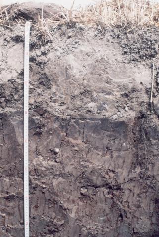 この断面は、転換畑(秋まき小麦)としての履歴が長いため、土壌は乾燥し、縦に割れ目(キレツ)が多数入っています。表土は40cmまで腐植含量が多く、40cm以下は地下水湿性を示す管状斑紋が見られます。これは畑転換しても消失していません。なお、粘質は強いのですがキレツ(水みち)が発達しているため、ほ場の表面排水はそれほど悪くは有りません。
