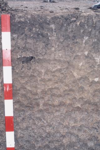 この断面は、長期間連作しているタマネギ畑です。表土の腐植含量はやや多く、下層土の土の色は灰色で、斑紋に富み、90cmの深さに湧水が見られます。