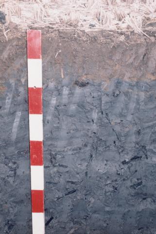 この断面は、表土は12cmで、以下81cmまでは斑紋が見られないグライ層(青粘土層)、81cm以下は泥炭層となっています。典型的な強グライ(全層グライ)土壌です。