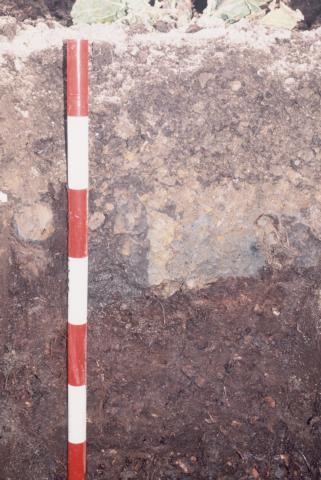 この断面は、前年に畑転換する際に大型プラウで深耕しており、38cmまでは泥炭を混入する粘土層で、38cm以下が完全な泥炭層となっています。客土後9年を経ていますが、洪積粘土を厚く客土したため、粘土層下部(18~38cm)はグライ化(青粘土)しており、表面排水がやや不良となっています。75cm深に湧水が見られます。