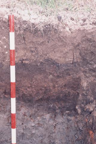 旧夕張川流域の低位泥炭土ですが、他の断面と異なり泥炭層は薄く、いわゆる表層泥炭土と言われるものです。泥炭土地帯の周辺に小面積で分布しています。また、平坦な台地上にも見られる場合があります。改良策は普通の泥炭土と同様で、泥炭層が薄いため有利な条件にあります。この地域では水田として利用されています。