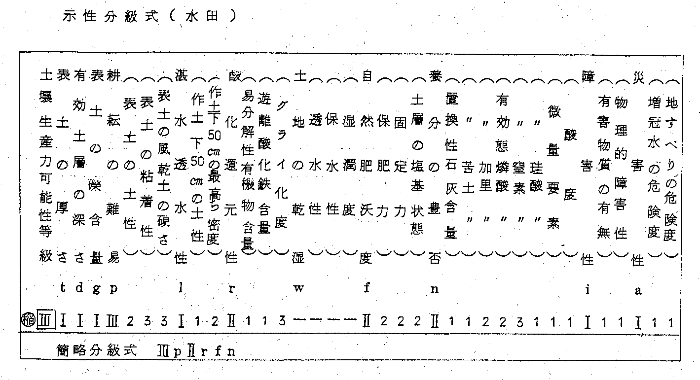 ある水田ほ場の土壌調査や分析の結果、水害の恐れが極めて高いため、a(災害性)についてはランクⅣ、石灰やりん酸などの土壌養分もやや不足しているためn(養分の豊否)はランクⅢ、表土の粘性が強いためp(耕起や砕土の容易さ)もランクⅢ、作土の厚さは15cmで適度なためt(作土の厚さ)はランクⅡ、土壌の還元程度も水田としては普通のためr(土壌の還元程度)もランクⅡ、とすると、簡略分級式(その土壌の作物生産力の評価式)はⅣaⅢpnⅡtrとなり、その他の項目は全てランクⅠ、つまり全く問題がないか、あるいは、極めて良好な状態であると評価されます。