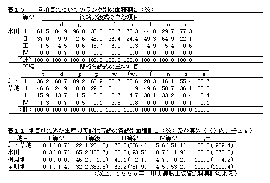 表10,11に簡略分級式の主な項目についてランク別に集計した一覧表を示します。ただし、これには古い年代の調査データも含まれているため、必ずしも現状を表しているとは限りません。