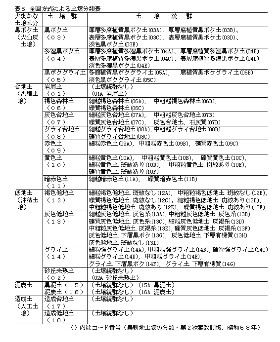 全国方式である土壌保全の土壌分類表を表5に示しました。全国の土壌は18種類の土壌群に分けられ、次に1~7種類の土壌統群に細分されています。全体としては18土壌群56土壌統群となります。このうち土壌群の中では、赤色土(09)と黄色土(10)の2種及び造成土が、北海道には存在せず、土壌統群については12種が存在しないことになっています。以下、各土壌群の特徴を簡単に述べます。()はコード番号です。