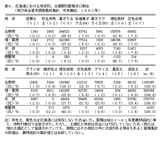 全国的に用いられている土壌分類法(農耕地土壌分類)では、大きな区分として16種の土壌群に分けられているそうですが、各土壌群の特徴や、北海道におけるそれらの分布面積やその割合を教えて下さい。