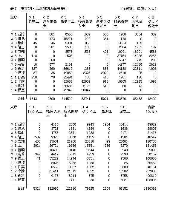以下に各支庁別に土壌分布の特徴を述べます。表7には支庁別×土壌群別の面積集計を示してありますのでご参照下さい。なお、面積は昭和60~61年版農林統計によったものです。