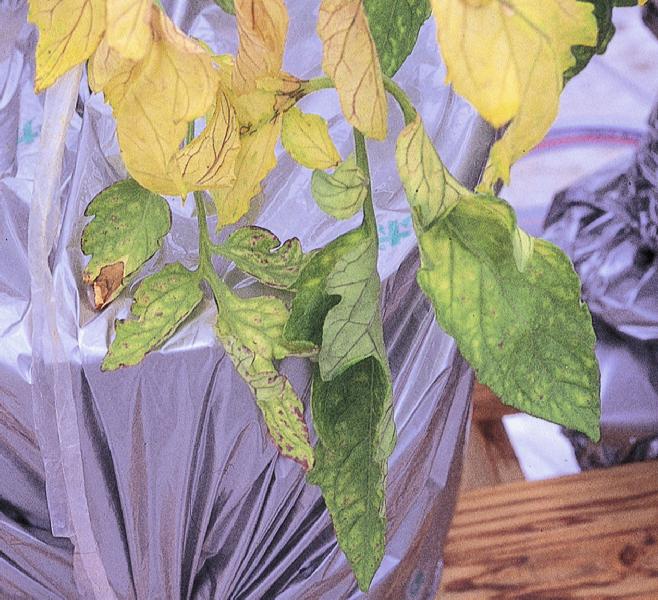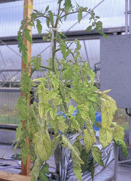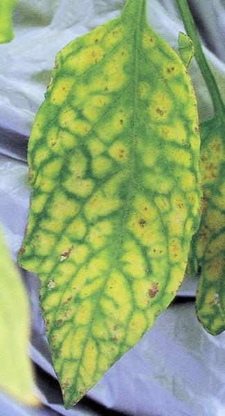 2.この症状はやがて中位葉へと進行し(写真24)、果実の肥大に伴い黄白化は激しくなる。しかし、最下部の葉は全面が黄化せず、葉脈付近に緑色を残し、葉脈間の黄化部分はやがて紫紅色を帯びる(写真25)。