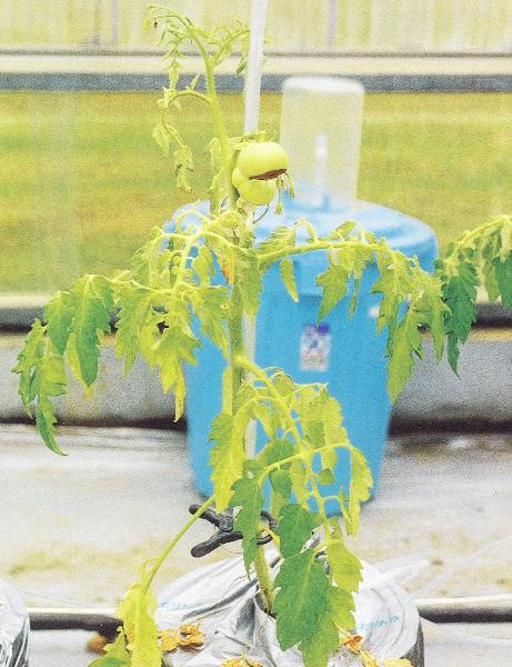 1.生育が著しく抑制されるとともに、上位葉はキュウリ、スイカ、メロンの場合と同様に亜鉛過剰に伴う鉄欠乏による葉全面の黄化白症状が現れ(写真54)、生長が著しく抑制される(写真55)。