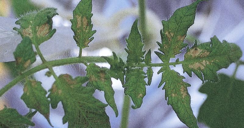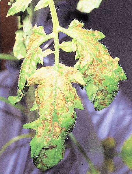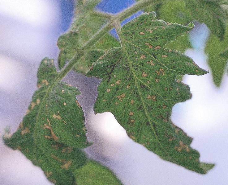 1.初期の段階では上位葉の葉脈間の一部に白斑が現れ(写真62)、さらに中位葉には葉脈間に白色〜褐色の斑点が現れる(写真63)。