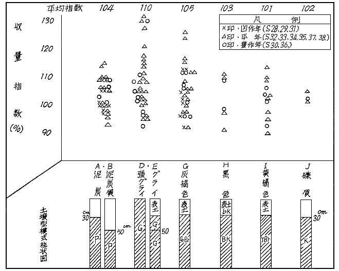 しかし、泥炭、泥炭質、黄褐色土壌においても充分、そのその効果が認められるわけであって、極概括的に表現すれば、深耕可能な水田では、土壌型の如何にかかわらずその効果が期待できるものが多いと判断されるが、前項の深耕効果の機作より考えれば、この結果はむしろ当然のことと思われる。