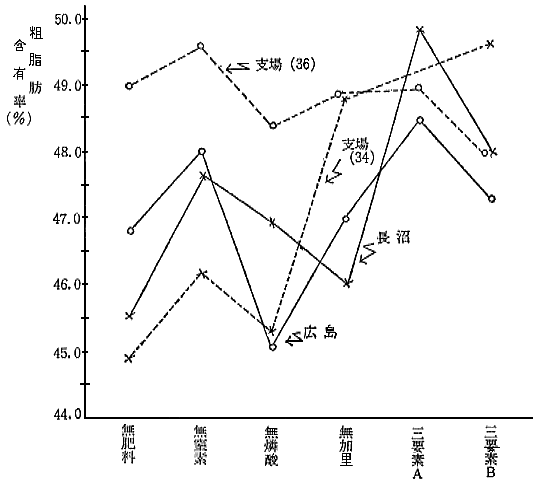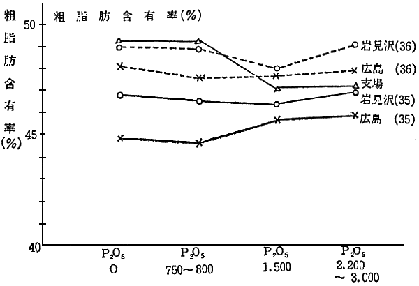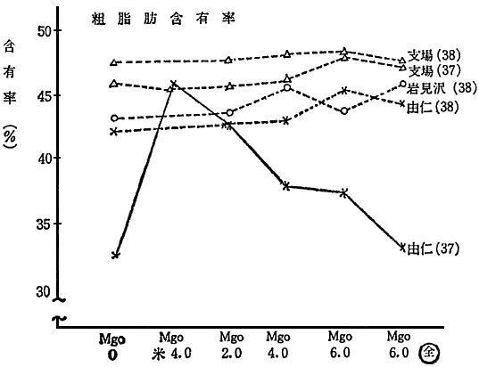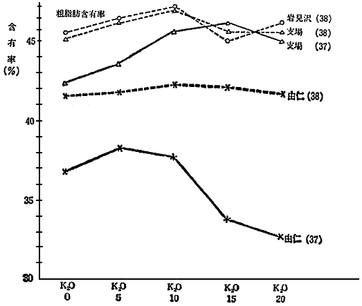 粗脂肪に於いても、その施用効果は認められるが、施用量との関連は余り明らかではなかった。(これは成熟期に於ける諸条件と大きく関連する事は勿論である。)