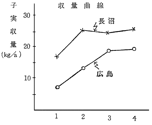 子実収量では、加里量増加につれ漸増の傾向を示すが15㎏/10a以上に於いては逆に減少傾向を示している。一方、品質の点では加里量増加につれ良好なる傾向を示しているがこれは成熟時の条件が大きく支配する様である。