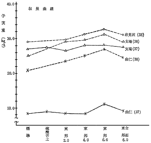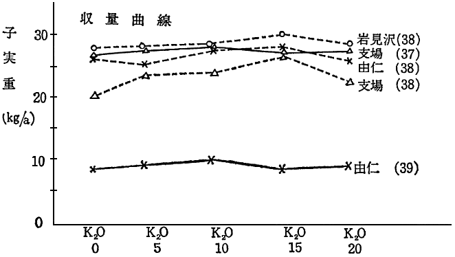 各試験地共に加里施用量15㎏/10a以上となると生育量は減少の傾向を示しており、これは特に窒素と加里の交互作用が現れているものと考えられる。