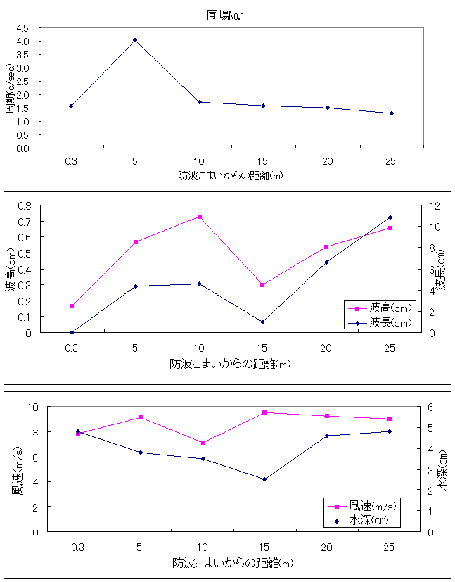 №3は、設置方向が風と約30°の角度で設置してあるが、1区面積が少ないため、効果があり無処理の1/2の波浪にとどまっている。