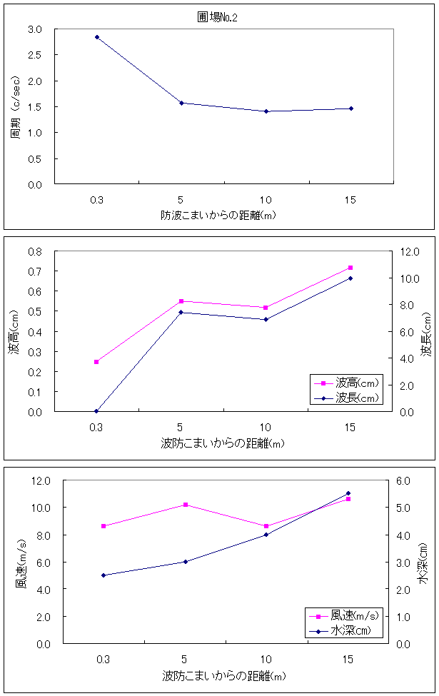 №2について見れば、防波こまいに対して、距離が大なるにしたがって、波高、波長ともに大となるが、15m離れた測定点においても、無処理地区の1/3にすぎず、極めて効果的であって、設置間隔は10m以下にする必要はない。