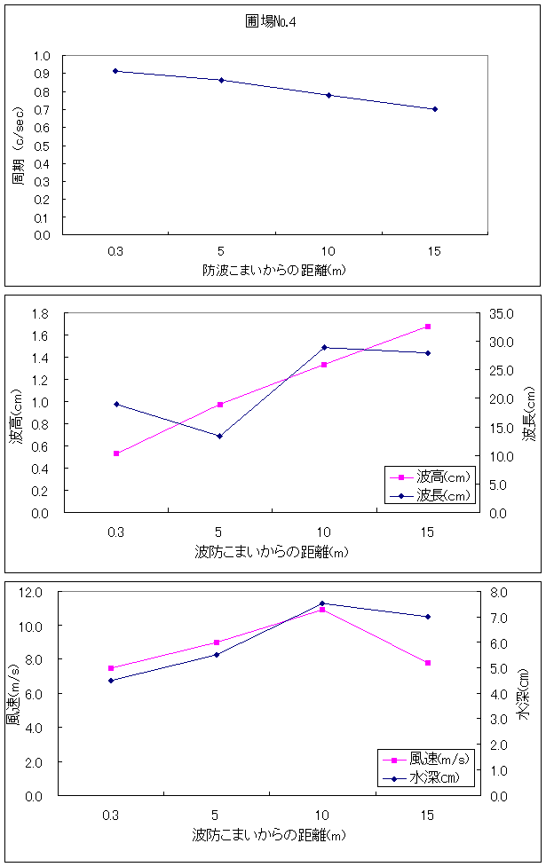 №4は、風の方向に対し約60°に設置してあるが区が大きく、間隔も大であるので、波防こまいから離れるにしたがって、無処理区の波とほとんど変わらない程度に大きくなっている。