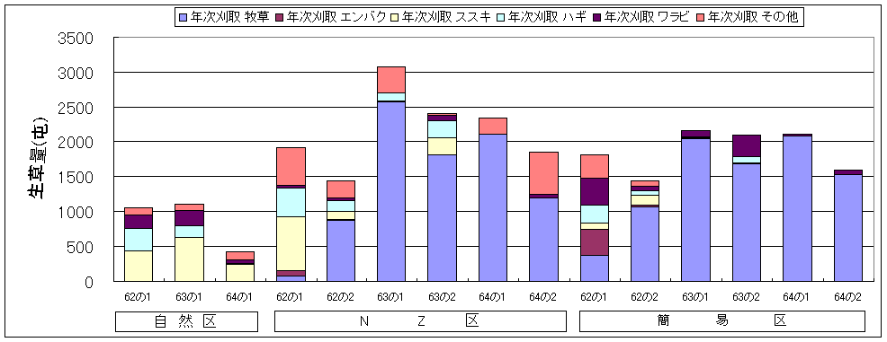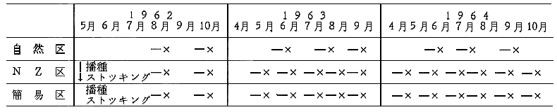 3処理区に夫々禁放区を設け、3ヶ年にわたり自然区は毎年8月上旬、NZ区および簡易区は2回刈取を実施して、植生の変化を調査した。