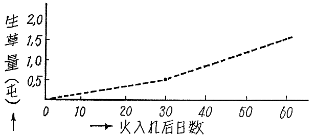 (4)火入れ後直ちに施肥、播種をしてストッキングを行うことについての工程は初年目の効果いついては、火入れ直後行うのがもっとも好結果が得られる。すなわち火入れ後ストッキングの時期を遅らせるほど越冬前における牧草率が低い。しかし一般には火入れ後34~45日頃の再生野草を利用ししながらのストッキングを行うのが補助飼料の節約、初年目の牧草定着野草の採食嗜好性、野草の抑圧などの効果を高くすることができる。