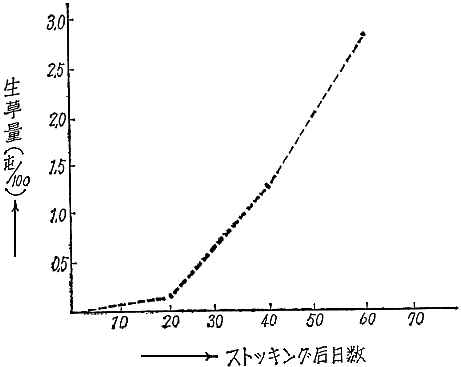 (6)ストッキング後再生野草は10a当り20日目150㎏、10日目1,200㎏、60日目2、800㎏のように生育を早める。従って第1回の放牧を何時行うかは、放牧地の良否の消長に影響を持つが、遅くなるほど導入牧草の生育を妨げるので、ストッキング後20~30日目くらい第1回の放牧を行うタイミングとするのが有利である。