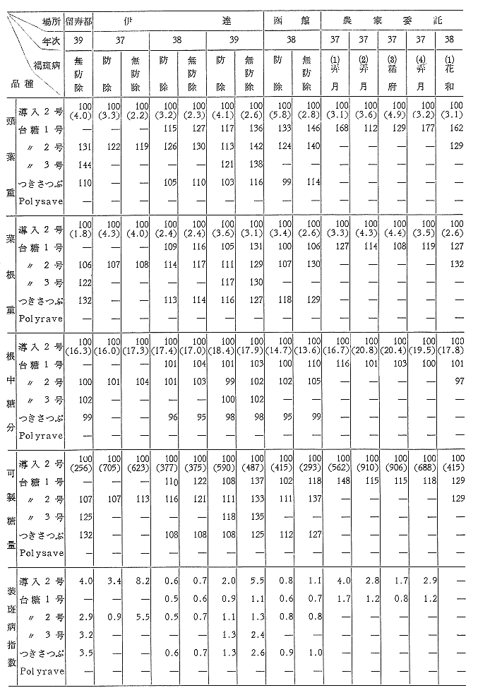 昭和38年度及び昭和39年度は褐斑病の発生が比較的少なく、又異例の気象条件と考えられるので台糖育成品種はその特性を充分に発揮したとは考えられなかった。当地方は例年褐斑病の発生が著しく、その為収穫期には頸葉の臭覚が著しく減少し、一般にはてん菜頸葉の飼料価値については余り期待されていなかったのであるが、褐斑病抵抗性と共に特に頸葉収量の高い、台糖1号、2号及び3号はこの点からも道南向品種として期待がもてる。