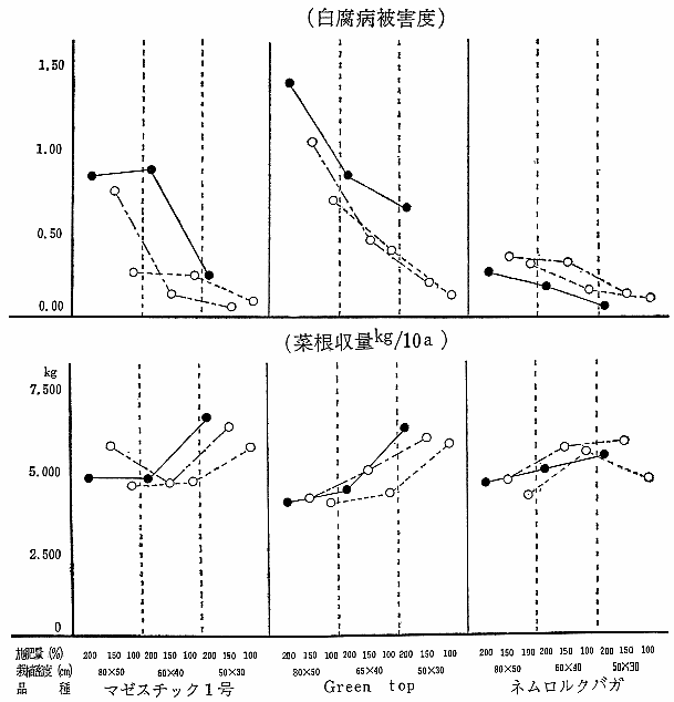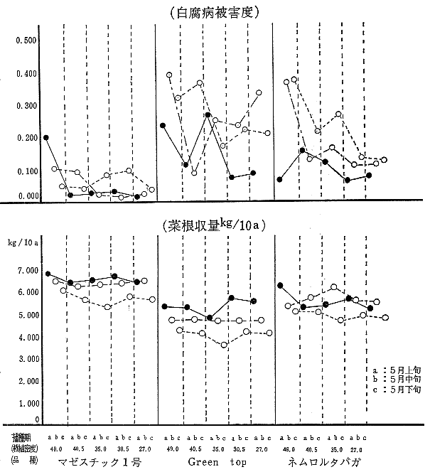 白腐病については全般に粗植で多発する点は前年2と同じで、又早期番種区で発生が少なかったので、品種と合わせて3要因とも有意な差を示したものと考えられる。しかし要因間の交互作用に有意性は認められなかった。菜根収量については、品種間に差があり、マゼスチック1号が多収であったが、栽植密度についての差はなかった。しかし、播種期及び播種期と品種との交互作用には有意な差が認められ、これは全般に早期番種程多収であることと、その傾向はGreentopとマゼスチック1号で殊に著しいことを示していると考えられる。