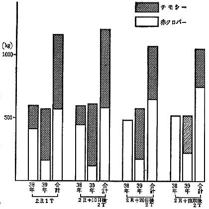 初年度は亜麻に対し、相対的にチモシーの生育が劣り、更に翌年度(昭和38年)伸長初期に強風乾燥にあい生育は不良で、特に20日後播種チモシー並に亜麻抜取後播種チモシーは殆ど収量はなかった。又赤クロバー、チモシー比率も前年度のに比しチモシーの割合が低くなっているが、全重ではやはりチモシーの播種時期が早い程一番草は被い傾向にある。