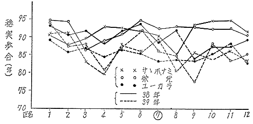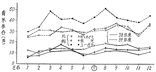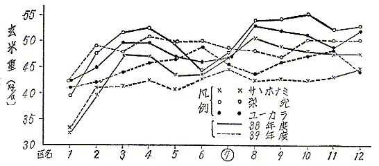 先に冷害の予想される年の施肥技術としては平年の窒素適量の判明している場合、幼穂形成期以降の分施を考えた施肥法が有利であることを明らかにした。即ち、予め基肥窒素量を2割程度減じて施用して置き、原則として幼穂形成期まで分施を行わず、幼穂形成期当時の生育相、生育量、その後の気象予報等から判断して分施が安全と考えられた場合、差控えた窒素量の範囲で分施を行い生育の調節を計ろうとするもので、この方法は出発点において冷害に対する抵抗性を増すことができ、また条件の良い場合は分施により窒素を基肥に全量施用した場合と同様或いは優る収穫をも納めうるもので冷害対策上有効なものである。