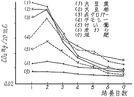 空気の存在する条件のもとで有機物の分解には酸素が消費されるので、緑肥が分解する場合、作物根は酸素不足の条件におかれるのでこれが障害の原因であり、又分解の時に発生する多量の炭酸ガスの影響も大きいと考えられ、従来この意見が強かったので更にこの点について検討してみた。