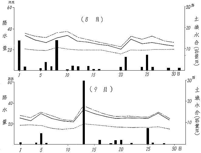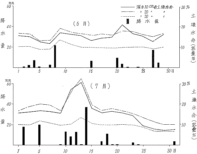 又、降水量が少なく、旱魃の続いた7月下旬頃には地表下10、20、30㎝の土壌水分含量は殆ど同一になる。