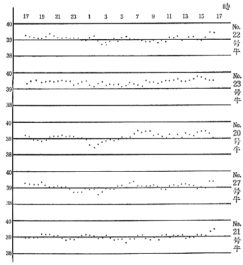 牛の分娩を中心としておこる生理的変化、血液学的、生化学的については既に種々報告もあるが、いづれの分娩時間予知法としては実用価値が乏しい、牛の分娩前後の体温変化は分娩時間の予知上実用的に価値があると云われているが、体温は牛側からは採食、運動等の変化、或いは1日のうちでも昼夜により生理的変動があり、測定側からすれば体温計そのものが正確か不正確か、測定部の適、不適、測定時間によっても誤差が生ずると考えられるので先ず体温測定が牛の分娩時刻予知上実用的価値あるや否やについて検討を加えた。