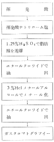 揮発性酸のガスクロマトグラフィー(以後ガスクロと略す)による分析は水蒸気蒸留によって揮発性酸を採取し、これをメチル化して分析した。試料の調製及びガスクロの分析条件は第1図のとおりである。