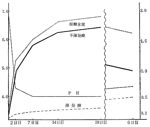 2) 揮発酸は2日目0.1%、28日目でほぼ0.2%程度増加するのに対して、6ヶ月後には2倍以上の0.58%に増加した。これとは反対に不揮発酸は2日目に0.1%、28日目に1.7%を経過し、6ヶ月目には0.7~1.5%の範囲に減少した。これらの現象に対応してPHは2日目の4.3から28日目の4.0を経過して、PHは2日目の4.3から28日目の4.0を経過し6ヶ月目4.3~4.6上昇した。