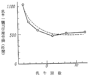 9)穀菽経営より有畜経営へ組織転換による農業総投下労働は、(A)農家は8専時間内外と大差が認められなかったが、(B)農家は4割増の6.4千時間と増大している。併し、部門別投下労働は畑作部門から有畜部門の労働の質的変化が認められている。叉(A)農家の乳牛頭数と1頭当乳牛管理労働(飼育+搾乳)との関係をみると、乳牛規模が小さい場合には、1頭当管理労働は多くかかる傾向にあるが、6頭以上は約500時間とほぼ一定である。この事は将来多頭化の方向をとり、稼働力に限界がある際には乳牛頭数が規制される原因となる。