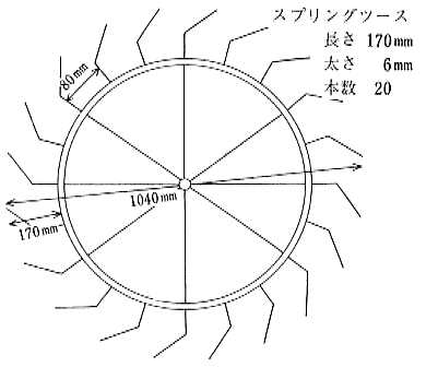 1. 試作した藁稈すき込み用レ-キと供試プラウ耕起部分の藁稈をすき溝に移動させるアタッチメントとしては、すでに牧草用として実用化されている回転輪型サイドデリバリ-レ-キの作用性に着目し、これを応用した。耕起巾50cmのプラウを対象として試作したレ-キは第1図の通りである。