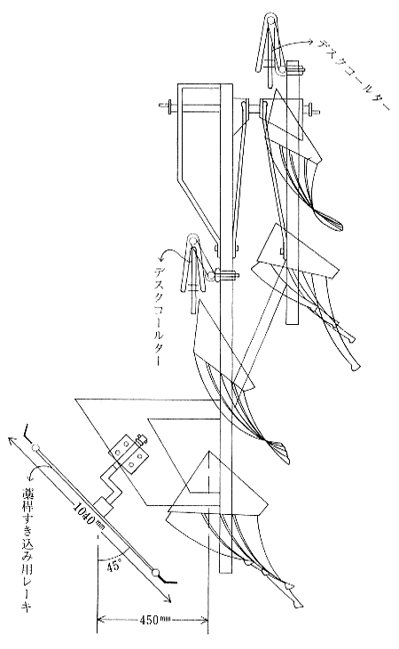 レ-キの取り付け角度は上記の条件では進行方向に対して45°がよかった。レ-キの作用巾を広くして藁稈を完全にすべき溝に移動させようとすると、藁稈の一部は溝を超えて既耕地に散乱するので、藁稈の一部が次の耕起部分に残る程度にするとよい。