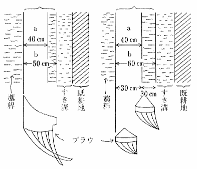 a レ-キによって藁稈の移動した巾 b プラウの耕起巾 この場合A・Bともにプラウに藁稈 はつまることなく、反転すき込み性能 は良好である。 |