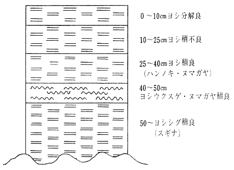支場内のヨシを主体とする低位泥炭地(借用地)で、30年程前に明渠を施行したが、経年とともに次第に排水不良となり、昭和36年に再び暗渠を施行した。翌昭和37年に草地造成すべく笹等の焼払いを行い、昭和38年及び39年に造成した新墾地である。尚昭和37年若干であるが放牧したことがある。土壌断面は下図の通りである。排水は間隔15m、暗渠又は明渠とした。