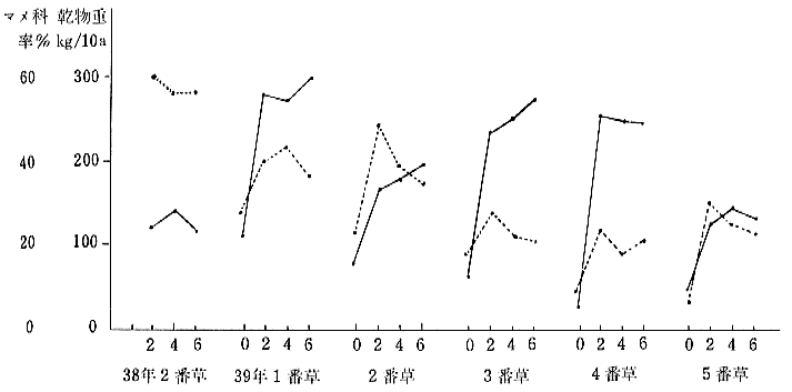 試験経過中、特記すべき障害はなかった。第1表、第2表によると造成当初の昭和39年1番草においては、明らかにリン酸の無施用区、即ちN単用、K単用、無P区無肥料区のみ、収量著しく劣り、マメ科率はリン酸の施用区で、少なくなる傾向を示した。39年度2番草に至ると、風乾物量で、リン酸の施用効果も認められるが、次第にカリの施用果が認められるようになり、特にマメ科率の高くなることがわかる。(2番草無N区、3要素区のマメ科率が少ないは1番草の良好な生育に伴う倒伏によって、葉腐病が発生し枯死したための影響である。)この傾向は40年になると一層強く現れ、風乾物収量では1~4番草とも、カリの施用効果が最も高くなり、特にリン酸の併用により顕著である。マメ科率では、カリの伴わないリンの施用区(P単用、無K区)では益々低くなり、3番草では、マメ科は皆無とまった。これに対してK単用区のマメ科率は最も高く、叉リン酸とカリの併用区(無N区)のマメ科率は次第に増加した。無石灰区は両年とも1番草の風乾物収量は比較的高いが、2番草より次第に低下し、マメ科率は極めて低く、40年3番草で消滅した。当試験の結果から、ヨシを主体とする低位泥炭地では、当初リン酸が最も必要であり、他の土壌に比べて比較的早い時期から、カリの効果が顕著に認められた。
