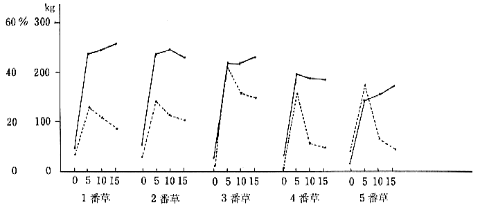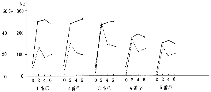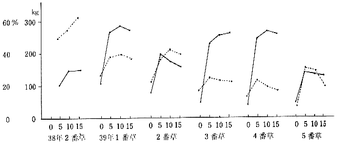 当試験は前記の3要素施肥試験に於いて、泥炭地においては2年目のカリ肥効が最も高く、その量は凡そ5kg前後と推定されたので更に適確な用量を明らかにすることと刈取回数に及ぼす影響を知るために設計したものである。39年度の越年中に試験区の1部に野鼠の食害が若干あったのみで、両年とも略特記すべき障害は認めなかった。第7、8表によると39年度1番草ではカリの施用効果は明らかでなかったが、2番草以降ではカリの施用効果が認められ、刈取回数別に見ると6回刈取区に比べ4回刈取区肥効が常に高く、5kg施用まで略順調に増収し、なおも上昇の傾向を見せるが、6回刈取区では3kg施用の効果は顕著であるけれども5kg施用では強くなり、7kg以上では増収せず、マメ科においては、39年度3番草以降カリの増施に伴って低下の傾向を見せ、その程度は刈取期の進む程著しかった。風乾物収量の年合計を見ても同様の傾向が認められる。第10表の乾物生産速度についてみても両年を通じ、6回刈取区において、5kg施用しても高くならない。しかし乍ら4回刈取区においては常に5kg施用まで略直線的に高くなり40年度においては7kg以上の施用でなおも上昇した。このことは第12表のカリの利用率が6回刈取区に比べ4回刈取区が高いことに関連しているものである。カリ含有率はカリ施用量の多い程高い傾向を示し、特に6回刈取区で顕著である。刈取時期別のカリ吸収量(第11表)を見ると6回刈取区と4回刈取区とは略同様の傾向で、9kg施用まで略直線的に上昇している。このことは第7図のカリ吸収量の年合計を見るとなお一層明瞭であるが、6回刈取区では5kg以上施用区で、叉4回刈取区では7kg以上施用でカリの過剰吸収が見られる。