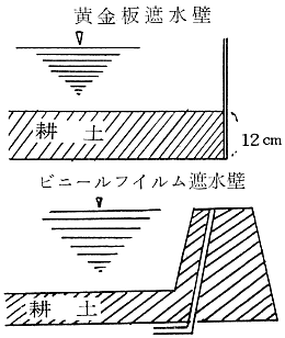黄金板及び畦畔ビニ-ルフィルムによる畦畔遮水壁の効果を見た。