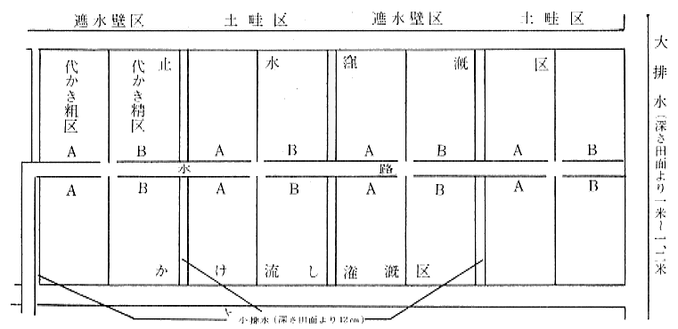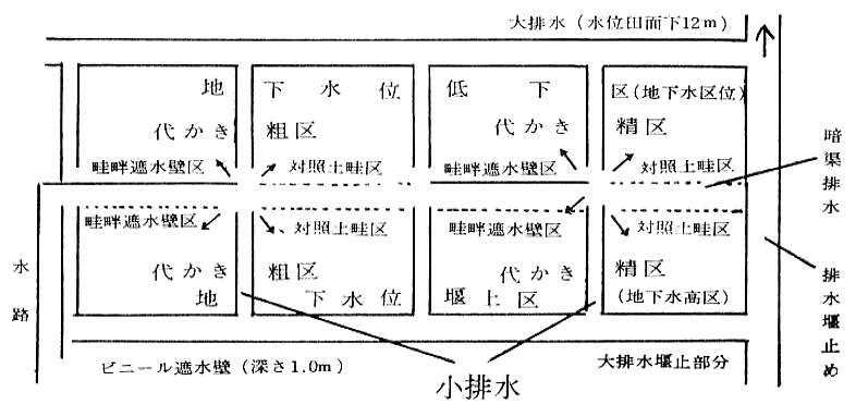 大区画-地下水位の高低による減水深差と稲の生育差を見るため地下水高位は甚水期間中明渠排水を堰き止めて水位を田面下30~40cm程度とした。地下水位低区は明渠排水の水位を田面下12mまで下げた両区の接する面の地下水低区寄りに暗渠排水を設置し、地下水高区寄りには巾1.2mのポリエチレンフィルムを埋設して遮水及び排水を行った。