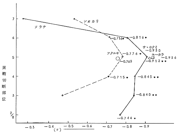 品種並びに部位別相関係数(r)の変動(幼形期1LS)
