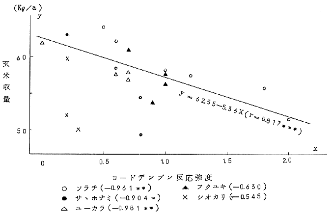 (1) 幼穂形成期における主幹最上位展開葉々鞘(止葉期は上から3LS)8/5部位のヨ−ドデンプン反応強度は、体内N濃度及び収量と極めて高い位負の相関々係にあり、かる再現性の大きいことが認められる。