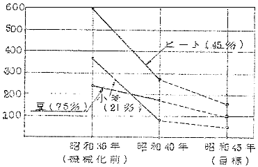 2) 機械化前と最終年度の生産労働の比較では(図1)の通り著しく省力化された。しかも作物は単純化され、根菜類、麦類の機械化が確立されこの作付面積が増加し(表2)安定した生産が得られ生産性は著しく向上した(表3)