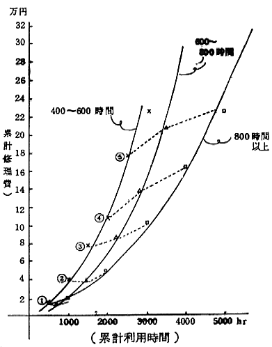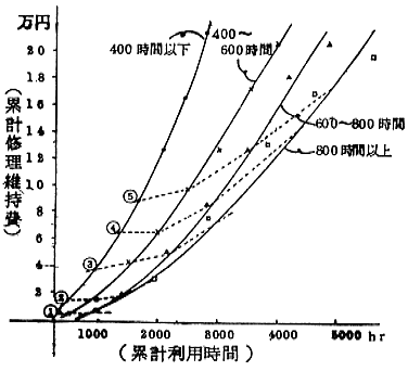 2) 修理費は事例によって偏差が大きく、個別性が強い。それは、主として④による修理費によって生ずる。しかし、使用年数の経過に伴い①と②による修理費が増加するから偏差は少なくなる。