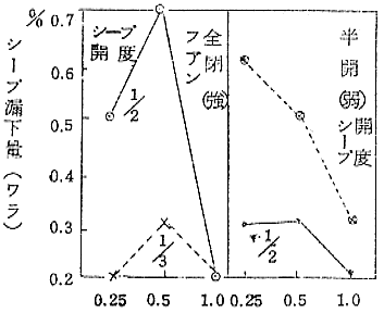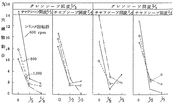 1) 再選別装置の夾雑物除去率は、シ−プの開閉度によって増減し風量を増した場合は、開度を小さく、減少の時は半開度程度に調製することによって選別効果を高めることができる。