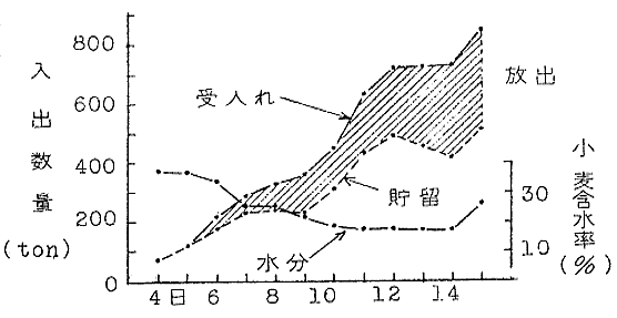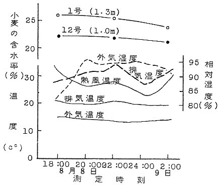 3) 中水分になってから貯蔵し、乾燥をも進める方法を行ったが、15〜20日間で毎日0.2%程度の乾減が進んだ。これは毎日1時間の通風を行ったもので貯蔵はじめの水分は、18〜23%で、貯蔵中なんの変質もみせなかった。