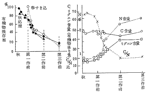 4. 有機物組織のうち急激な減少の起こるのはセルロ−ズ、0.7NHCl可溶炭水化物などで、窒素、リグニンなどは第2作目までは余り変化なく残存した。C/N比は第2作目の初めに約20となり堆肥並にとなることを認めた。