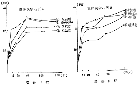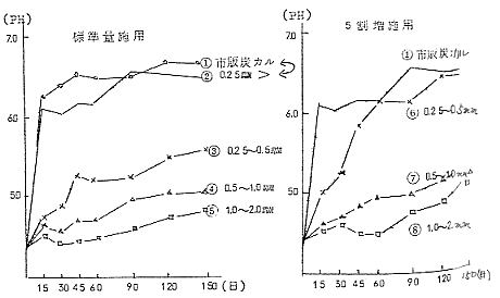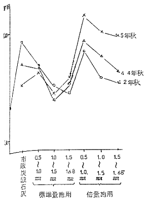 (4) この資材の使用に当たって、市販炭酸石灰(規格炭カル)と同等の効果を得るには、酸性矯正力、作物の生育収量との関係からみて市販炭酸石灰より30%内外の増施が妥当である。