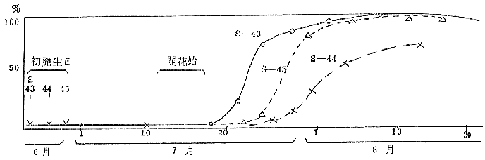 2. 開花後、病原菌(子のう胞子)は主に花弁より侵入し、急激に発病株率は増大する。この時期を急激発病増大期とした。この時期の把握が防除上重要であることを明らかにした。